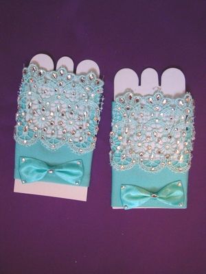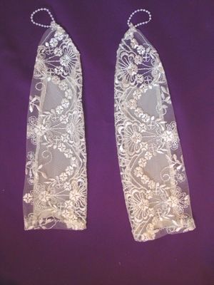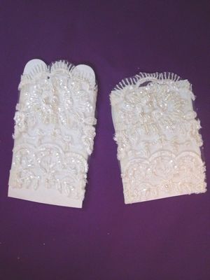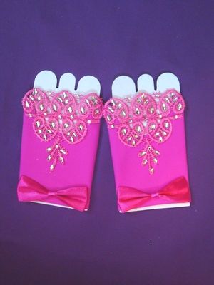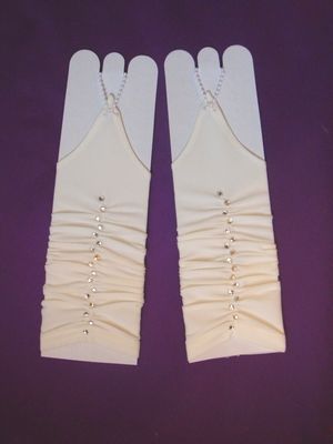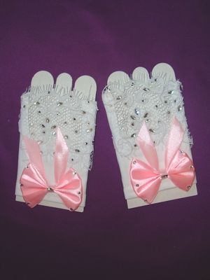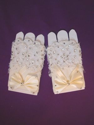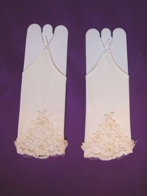 Самый распространенный тип - это без пальчиков, изготавливаются из кружевной ткани с петелькой надетой на средний палец, удобство заключается в том, что в ЗАГСе надевается кольцо на палец без снятия данного аксессуара.